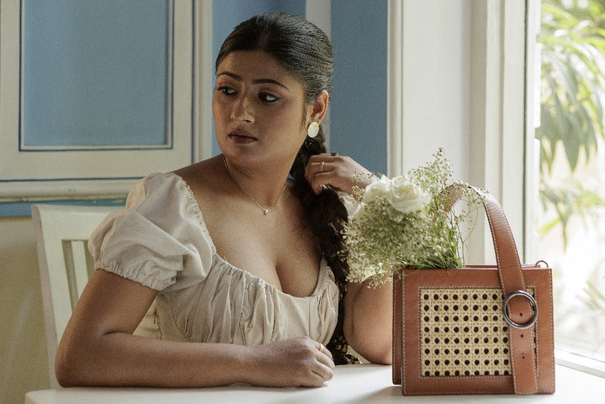 Crafted in handwoven cane and supple cow softy leather, this structured mini carries modern elegance in every detail.
